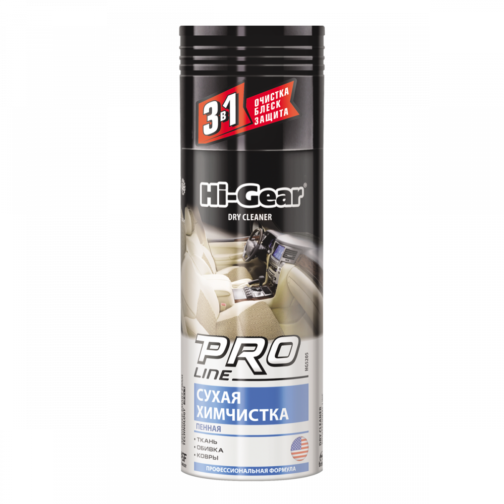 Сухе хімочищення, аерозоль (пінний) професійна формула Hi-Gear ефективно видаляє більшість плям і забруднень із тканих оббивок і килимових матеріалів салону автомобіля. Надає обробленим поверхням антистатичні, брудо- і водовідштовхувальні властивості. Водночас поверхня покривається особливим високотехнологічним шаром, який забезпечує їй оновлений вигляд і створює довготривалий захисний бар'єр від забруднень.