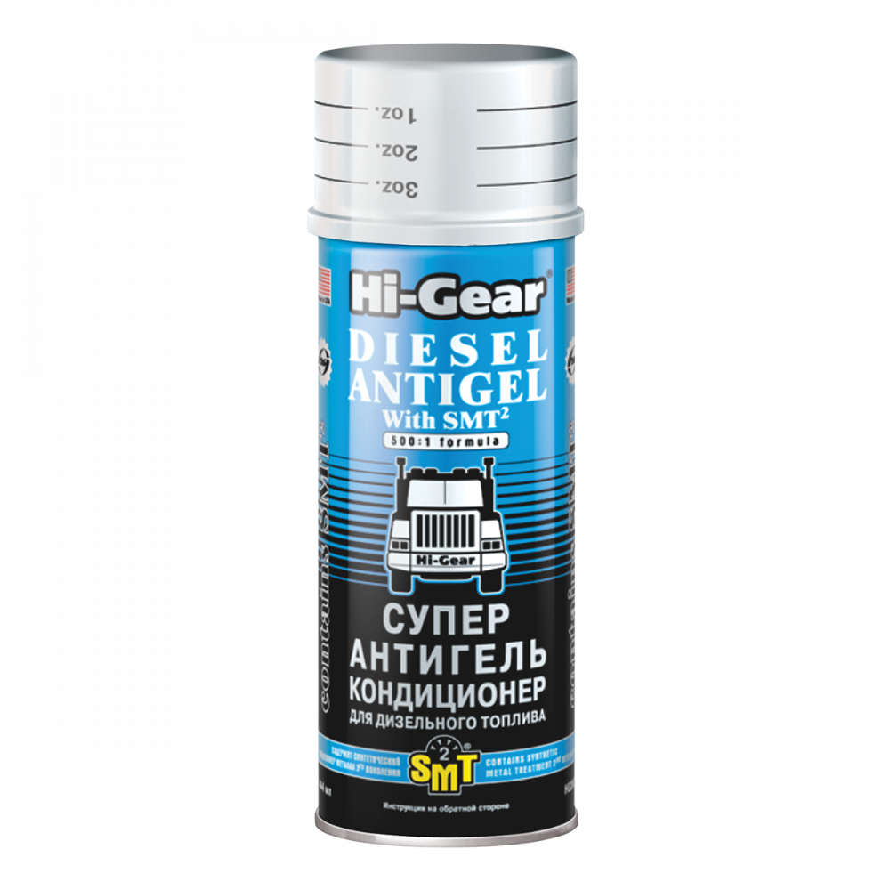 Антигель дизельного палива з SMT² HI-GEAR запобігає замерзанню робочої рідини, що дозволяє експлуатувати транспортний засіб при температурі -47 °C. До складу входить кондиціонер металу SMT² на синтетичній основі, який змащує робочі поверхні, запобігає передчасному зносу деталей паливного насоса.