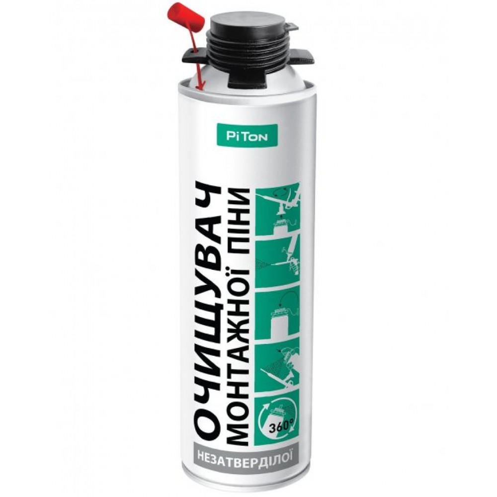 Очищувач монтажної піни PITON — спеціальний засіб для очищення незатверділої однокомпонентной поліуретанової піни з металевих, пластикових та інших непористих поверхонь. Легко наноситься у важкодоступних місцях. Призначений для видалення незатверділої піни з інструментів, одягу та інших поверхонь. Ефективно очищує внутрішні та зовнішні поверхні монтажного пістолета.