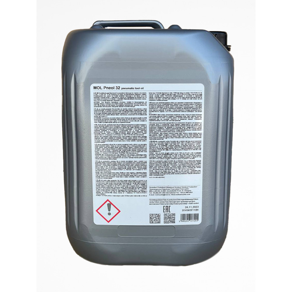 MOL Pneol 32 це масло преміум якості, розроблене для ручних пневмомашин та машинного обладнання з високою пропускною спроможністю. Це високоочищене мінеральне масло, що містить антиокисні, протизносні, антикорозійні присадки, емульгатори та присадки, що покращують адгезію. Продукт швидко утворює масляний туман, формує міцну мастильну плівку з високою несучою здатністю, завдяки чому значно зменшується тертя. При прямому контакті з вологою продукт перетворює абсорбовану воду на емульсію, тому мастильна плівка захищає металеві деталі від корозії.