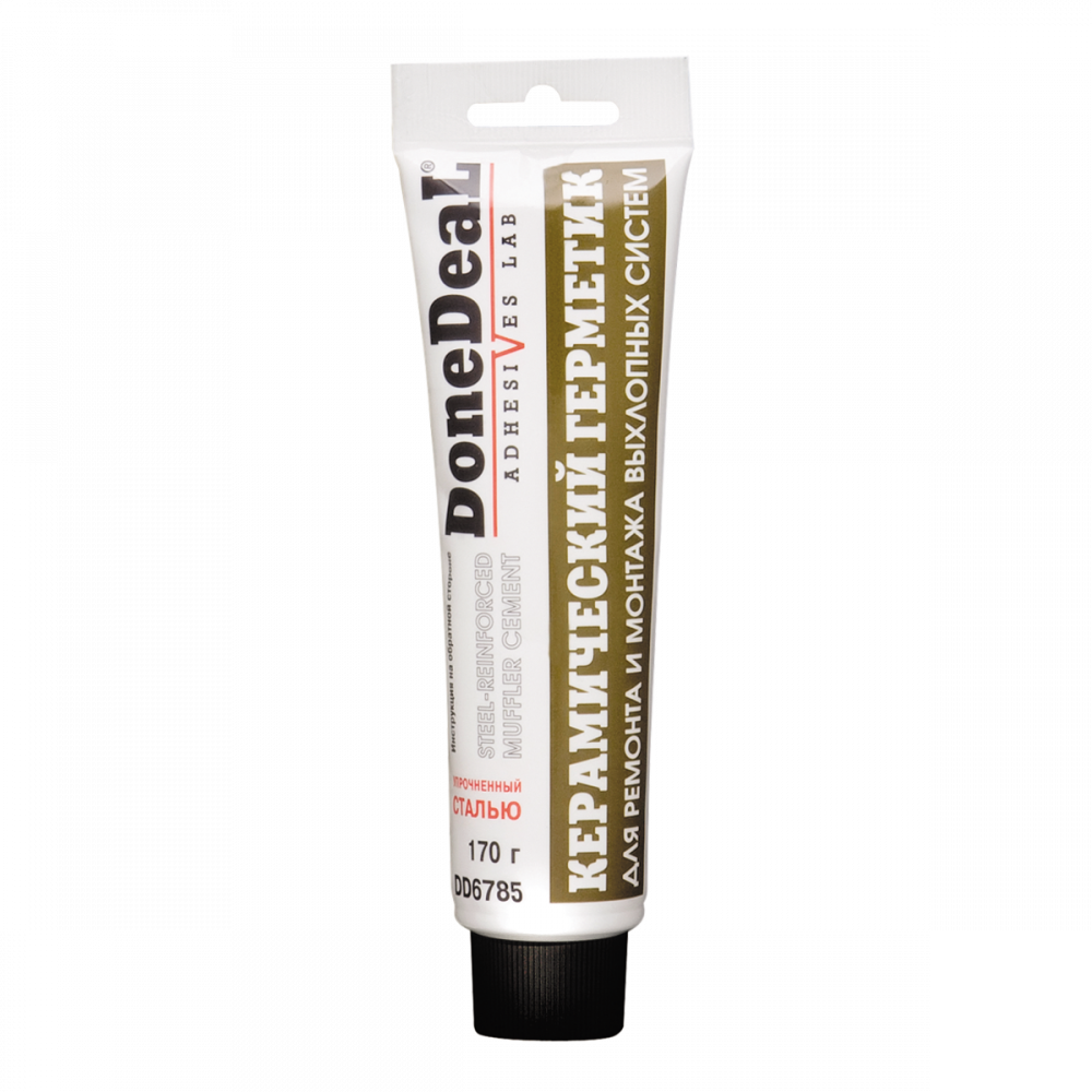 Герметик Done Deal на основі керамічних волокон призначений для швидкого ремонту системи випуску відпрацьованих газів в автомобілі. Забезпечує герметичність швів та стиків при монтажі систем випуску відпрацьованих газів у транспортному засобі. Використовується для обробки глушника, труб та інших деталей. Закупорює невеликі наскрізні тріщини та отвори, що утворюються в елементах під впливом високих температур.